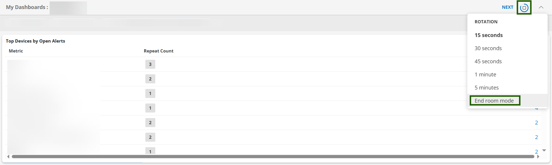 - This option displays a collection of dashboards in room mode with the ability to set the time duration for each dashboard.
